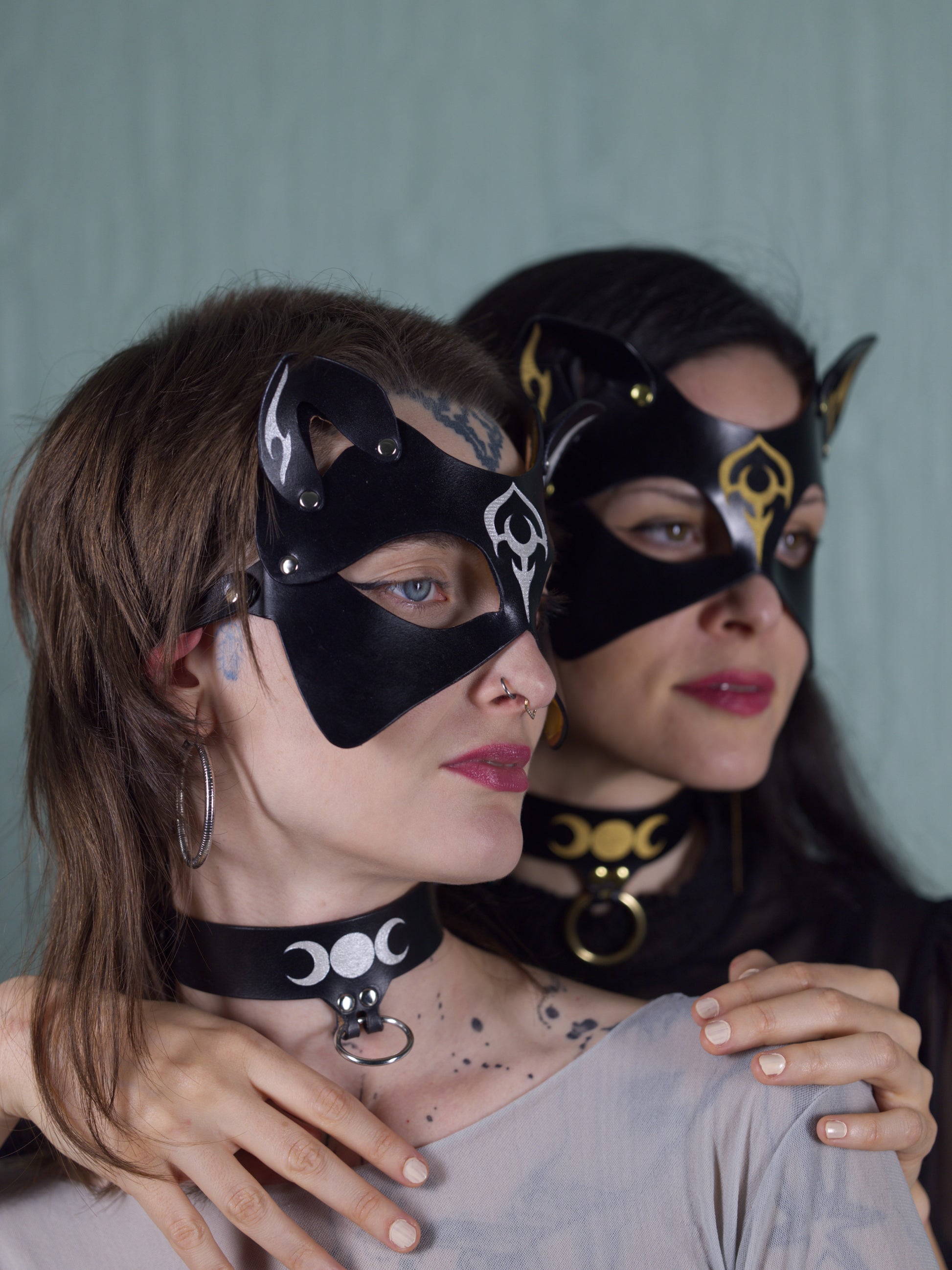 A minimalist silhouette with celestial bite. This handmade leather choker features a centered engraved triple-moon (triple goddess) crest, hand-painted with ultra-fine micro-brushwork in bright silver or warm gold to match your chosen hardware. A hanging O-Ring sits just beneath the motif on an integrated mount, so the main strap remains clear for the lunar engraving—clean, balanced, and striking.